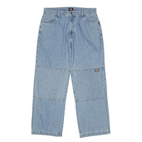 Fabric/Description: 12.5 oz. 100% cotton denim, loose fit, tack button closure, dual front pockets with watch pocket detail, back patch pockets with woven Dickies logo label at left pocket, true double knee and garment washed for lived in feel