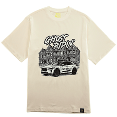 The Ghost Ridin' Tee in natural is a 6.5 oz 100% cotton heavyweight short-sleeve shirt with a glow-in-the-dark screen-printed design on the front. It provides a structured fit and a visible glow effect for low-light settings.