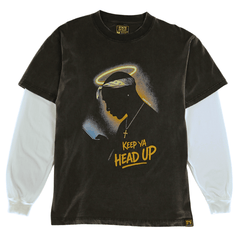 The Keep Ya Head Up long-sleeve tee is a 7.5 oz 100% cotton heavyweight oversized shirt that pairs a statement front print with attached white sleeves. It offers structured warmth and a relaxed fit so you can layer comfortably while staying visible and present.
