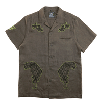 Fabric/Description: 100% linen short-sleeve button-up with embroidered and chain stitched designs on the front shoulders and bottom, left chest slit pocket, woven label on the front bottom and embroidered State Of Flux mantra on the right sleeve