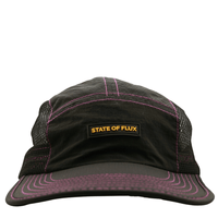 Fabric/Description: 70% recycled water-resistant nylon body, 30% polyester mesh low-profile 5-panel cap with a rubber label on the front, reflective strips on the sides for night visibility, a bendable front bill for quick storage in your pocket or bag, and a shock cord and toggle back adjuster for a lightweight, secure fit.