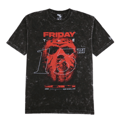 This Friday The 13th tee in mineral wash black is a 100% cotton 6.5 oz short-sleeve shirt with front and back Jason Voorhees printed graphics and an embroidered New Era logo on the left sleeve. The mineral-wash finish delivers a worn-in look while keeping the cotton construction intact.