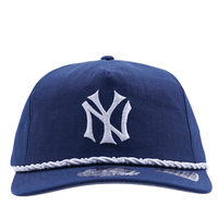 Fabric/Description: 100% cotton golfer style strapback hat with raised embroidered front NY Yankees logo, a pre-curved bill, pearl rope, flat embroidered New Era logo on the left side and grey underbill.