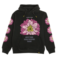 Fabric/Description: 70% cotton / 30% polyester fleece heavyweight hoodie with screen-printed designs, embroidered State Of Flux script logo on the chest, and embroidered design on the marsupial pocket.