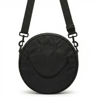 Fabric/Description: 100% nylon outer shell and 100% polyester inner lining circular bag with Smiley face embroidered on the front and adjustable strap